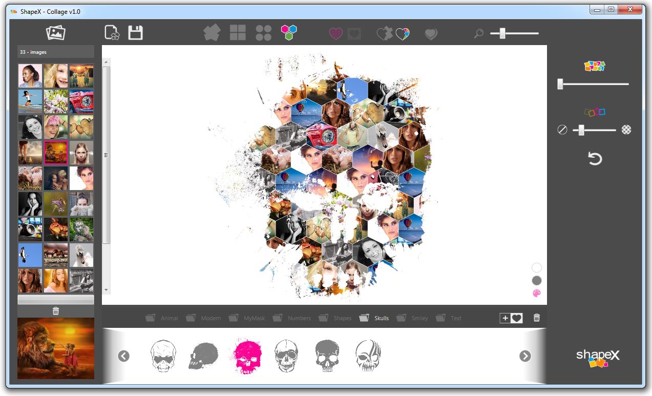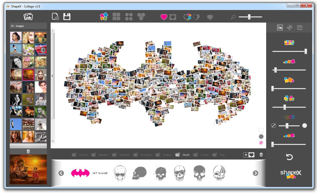 This program is called "ShapeX"., It is a ShapeX enables you to easily create custom photo collages in various shapes. You can choose from a variety of shape masks that are organized into several different categories (animals, numbers, abstract, text etc.). Just choose the images to use for the collage and then click on different shape masks to instantly preview the results.