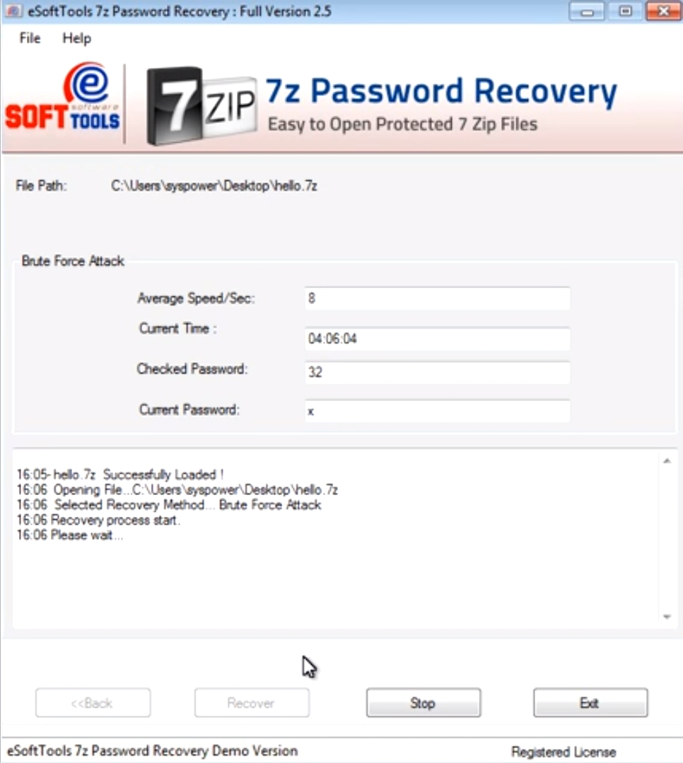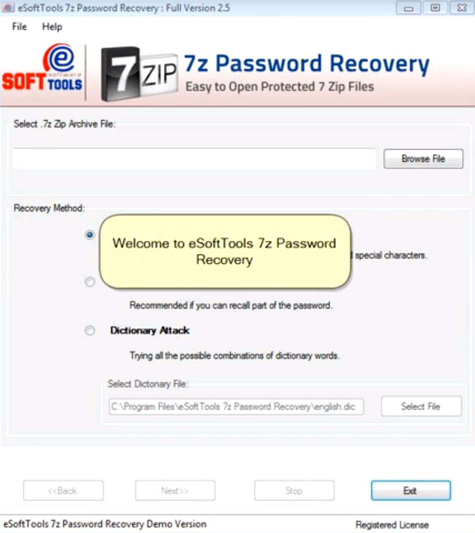 ด้านหน้าตาการใช้งานก็ดูใช้งานง่าย โปรแกรม 7z Password Recovery ออกแบบหน้าตามาให้เป็นมิตรต่อผู้ใช้งาน ส่วนของวิธีการปลดล็อกไฟล์ ก็ไม่ยุ่งยากอย่างแรกเลือกไฟล์ที่ต้องการ จากนั้นก็เลือกโหมดปลดล็อกพร้อมกับใส่จำนวนตัวอักษร อักขระ หรือตัวเลขเท่าที่จำได้ลงไป จากนั้นก็กดปุ่ม Next เพื่อเริ่มการกู้ทันที