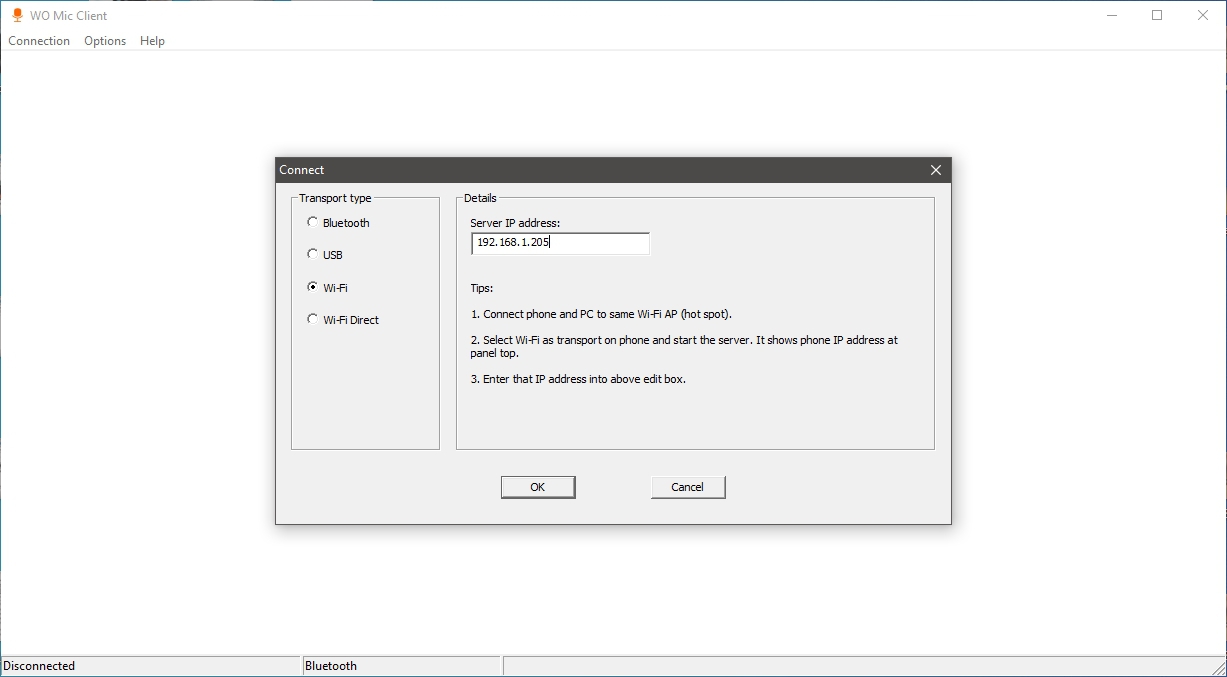 หน้าตา (User Interface) และวิธีการใช้งาน (Instruction) ของโปรแกรม WO Mic ก็ดูเรียบง่าย ไม่ซับซ้อน มีเพียงแค่แถบเมนูที่อยู่ด้านบนสำหรับเลือกคำสั่งฟังก์ชั่นต่างๆ วิธีการใช้งานไม่ยากแค่เลือกที่หัวข้อ Connection และเลือก Connect จากนั้นก็เลือกช่องทางการเชื่อมต่อว่าจะเป็น Bluetooth, USB, Wi-Fi, Wi-Fi Direct แล้วทำตามขั้นตอนที่โปรแกรมแนะนำได้เลย ไม่เกิน 4 ขั้นตอนก็เป็นอันเสริจ