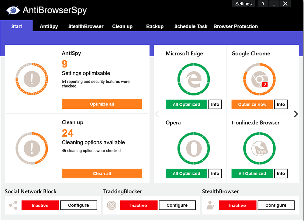 AntiBrowserSpy (โปรแกรมป้องกันสปายแวร์บนเบราว์เซอร์) : สำหรับโปรแกรมนี้มีชื่อว่า AntiBrowserSpy เป็นโปรแกรมป้องกันสปายแวร์จากการใช้งานอินเทอร์เน็ตบน เว็บเบราว์เซอร์ ซึ่งโดยส่วนมากเบราว์เซอร์อย่าง FireFox / Internet Explorer / Chrome / Safari และ Opera จะมีการตั้งค่า Privacy ที่ใช้ป้องกันภายในตัวอยู่แล้ว แต่โปรแกรมนี้จะช่วยตรวจสอบในทิศทางที่แตกต่างกว่า ซึ่งเมื่อเปิดโปรแกรมใช้งาน เราสามารถเช็คสถานะความปลอดภัยและตรวจสอบข้อมูลที่ไม่ถูกต้องได้ด้วยตนเอง รวมถึงปรับตั้งค่าให้เหมาะสมกับเบราว์เซอร์ที่ใช้ได้