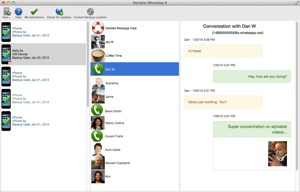 Decipher Chat (โปรแกรมสำรองประวัติสนทนาจากโปรแกรมแชท) : สำหรับโปรแกรมนี้มีชื่อว่า Decipher Chat เป็นโปรแกรมบน Windows และ Mac ที่ใช้ในการสำรองข้อความประวัติการสนทนาจากแอปพลิเคชัน WhatsApp, WeChat, และ Instagram Messaging apps ที่ใช้บน iPhone, iPad, และ iPod Touch.โปรแกรมสามารถดึงไฟล์แนบต่างๆ ไม่ว่าจะเป็นรูปภาพ หรือวิดีโอออกมาจัดเก็บได้ทั้งหมด รวมถึงสามารถแปลงออกมาเป็นไฟล์ PDF ได้ด้วย ซึ่งจะช่วยเก็บข้อมูลทุกอย่างรักษาไว้บนคอมพิวเตอร์ได้อย่างแน่นอน