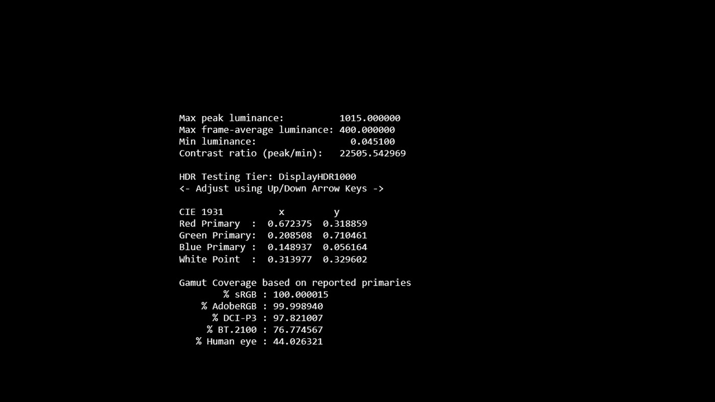 สำหรับการใช้งาน โปรแกรมทดสอบระบบการแสดงผลหน้าจอ DisplayHDR Test เครื่องมือนี้ จะมีหน้าตาสำหรับวัดค่าแสดงผลสี HDR ช่วงความกว้างของการแสดงผลแสงที่มีความสว่างของภาพ (High dynamic range) ของจอมอนิเตอร์ที่ใช้งานอยู่ได้ โดยจะมีค่าพารามิเตอร์ (Parameter) ของจอภาพแสดงเป็นหน่วยต่างๆ ทั้งค่าแสงที่สามารถแสดงได้สูงสุด / ประมาณค่าแสงที่สามารถแสดงสูงสุดของแต่ละเฟรม / ค่าความต่างของสัดส่วนการแสดงผล / ระดับการแสดงผลของ HDR 400, 600 และ 1000 ตามลำดับ แถมยังบอกค่าสี RGB และ White Point ที่จอสามารถแสดงผลได้ ช่วยให้ผู้ใช้งานรู้ค่าที่จอภาพแสดงผลออกมาได้ ผ่านการทดสอบของโปรแกรมนี้
