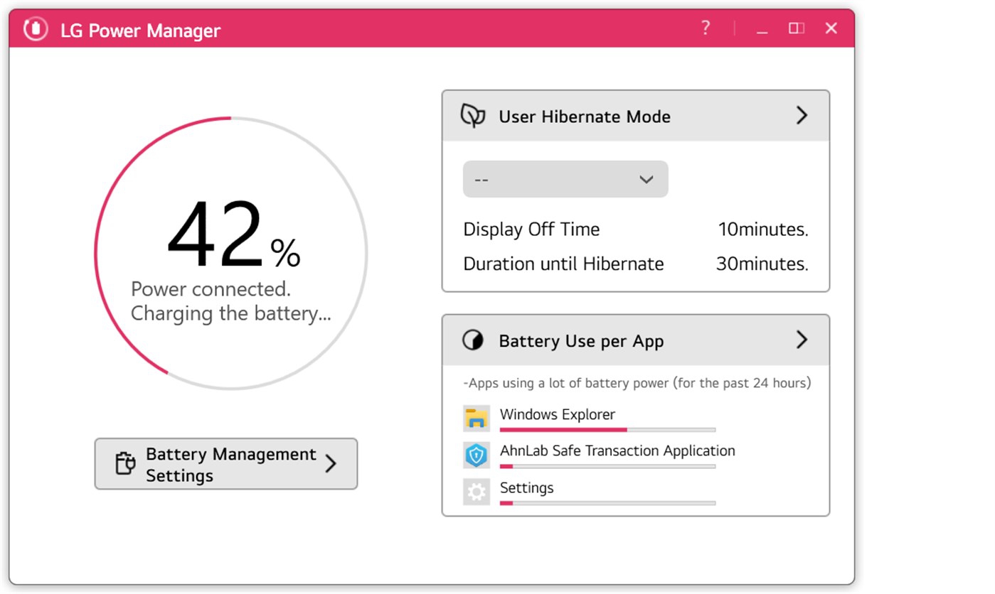 LG PowerManager (โปรแกรม LG PowerManager ถนอมพลังงาน จัดการแบตเตอรี่ จาก LG) : สำหรับโปรแกรมนี้มีชื่อว่า โปรแกรม LG PowerManager เป็นโปรแกรมสำหรับจัดการแบตเตอรี่ จากบริษัท LG ที่จะช่วยให้ผู้ใช้งานสามารถเข้าไปตั้งค่าการใช้พลังงาน ให้เหมาะสมกับสภาพแวดล้อมการทำงานรูปแบบต่างๆ เพื่อให้แบตเตอรี่มีอายุและเวลาใช้งานได้อย่างมีประสิทธิเข้ากับการทำงานได้ดีมากขึ้น รองรับการติดตั้งและใช้งานบนคอมพิวเตอร์ โน้ตบุ๊ค LG และโน้ตบุ๊คที่ใช้งาน Windows 10