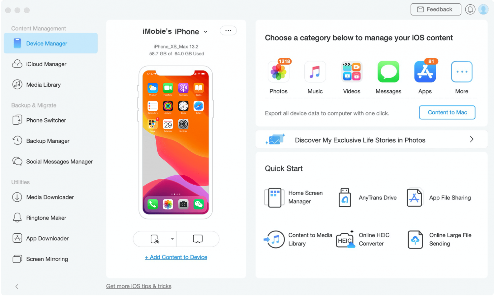 สำหรับการใช้งาน โปรแกรมจัดการโอนถ่ายข้อมูล AnyTrans หลังจากคุณติดตั้งโปรแกรมนี้ลงบนเครื่องคอมพิวเตอร์ Windows และ macOS ให้คุณทำการเชื่อมต่ออุปกรณ์ iOS จากนั้นตัวโปรแกรมจะแสดงข้อมูลบนหน้าจอของคุณ คุณสามารถเลือกจัดการข้อมูลแต่ละรูปแบบในเครื่องได้ ทั้ง สื่อมีเดีย รูปภาพ, เสียง, วิดีโอ, ข้อมูล, แอปพลิเคชันแบบต่างๆ และอื่นๆ ย้ายลงเครื่องคอมพิวเตอร์ เพื่อประหยัดเนื้อที่สำรองข้อมูลอุปกรณ์ของคุณได้ง่าย