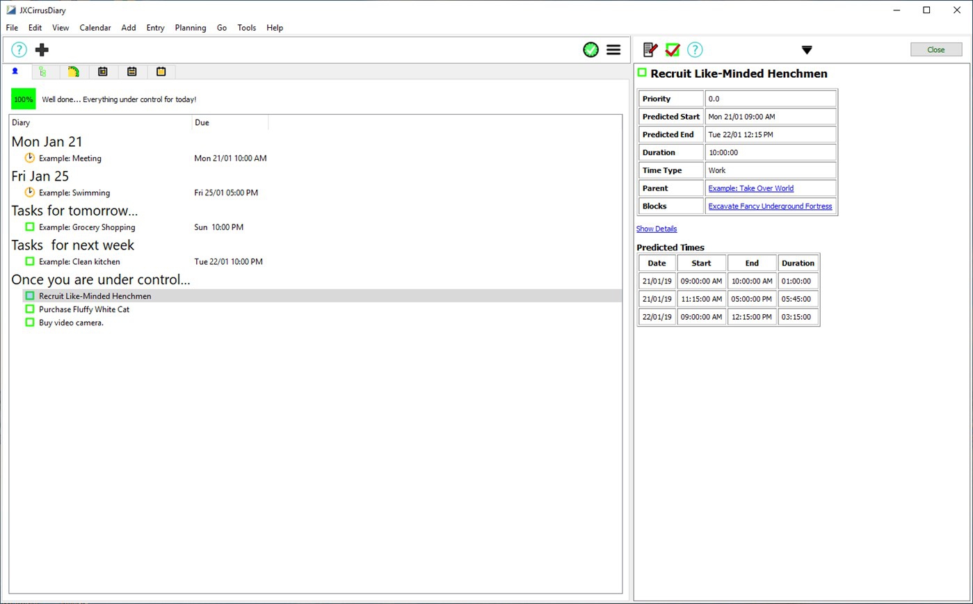 This program is called "JXCirrus Diary". It is a combination of calendar, to-do list, addressbook and journal. You can enter your list of jobs for the week, and tick them off as you finish them. It is nice and quick to enter the information, and JXCirrus Diary will warn you when tasks or appointments are due. But hidden under the surface are some far more powerful features.
