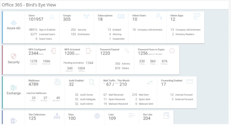 AdminDroid (ระบบจัดการ Office 365 วิเคราะห์ข้อมูล ดูความเคลื่อนไหวของผู้ใช้งาน) : สำหรับโปรแกรมนี้มีชื่อว่า โปรแกรม AdminDroid เป็นระบบจัดการ Office 365 ใช้สำหรับวิเคราะห์ข้อมูล รายงานความเคลื่อนไหวของผู้ใช้งานผ่านหน้าต่าง Dashboard ที่ดูเรียบง่าย เมื่อถามว่าระบบของ AdminDroid สามารถใช้ดูสถิติข้อมูลอะไรได้บ้าง ก็ตั้งแต่ ข้อมูลการออนไลน์ การใช้งานบัญชีของผู้ใช้งาน Office 365, ดูสถิติข้อมูลไลเซนส์ในระบบ, สถิติระบบความปลอดภัยการป้องกันต่าง ๆ ตลอดจนการดูสถิติความเคลื่อนไหว และปรมาณการรับส่งอีเมล (Outlook) เป็นต้น