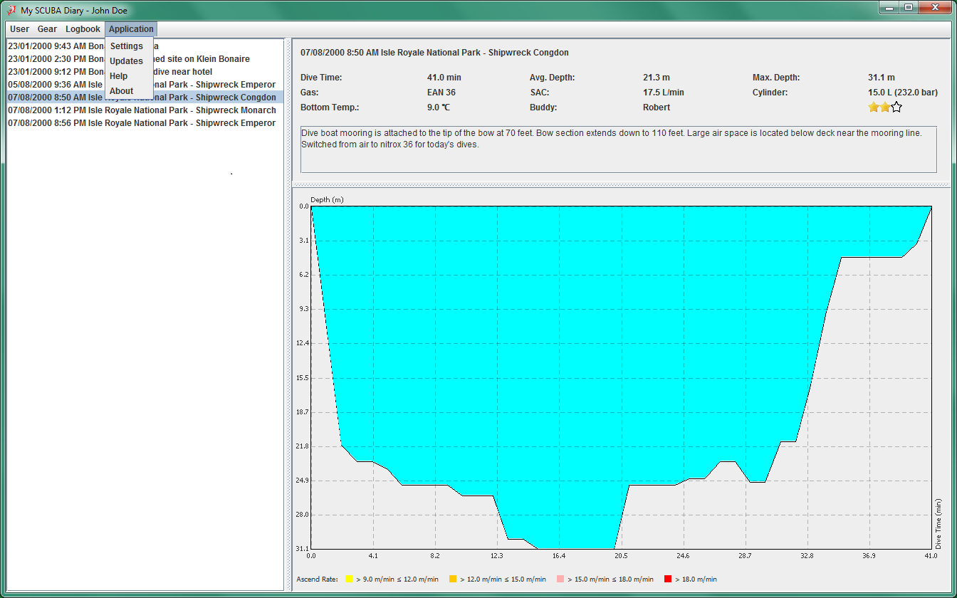 My SCUBA Diary (โปรแกรม My SCUBA Diary บันทึกการดำน้ำสกูบา ไดอารี่ดำน้ำลึก) : สำหรับโปรแกรมนี้มีชื่อว่า โปรแกรม My SCUBA Diary เป็นโปรแกรมสำหรับจดบันทึกการดำน้ำลึก ใช้เป็นไดอารี่ส่วนตัวในการจดประวัติการดำน้ำย้อนหลัง เหมาะสำหรับคนที่ชื่นชอบการดำน้ำลึกสไตล์สกูบาที่ดำน้ำอยู่เป็นประจำและกำลังหาโปรแกรมที่ช่วยจดบันทึกข้อมูล ใช้โปรแกรมนี้บันทึกข้อมูลการดำน้ำในแต่ละครั้ง ระบุได้ทั้งวันที่และเวลา สถานที่ดำน้ำ ระยะเวลาที่ดำลงไป ความลึกของน้ำ ปริมาณออกซิเจนที่ใช้งาน ชื่อคู่หูที่ดำร่วมกัน รวมถึงจดบันทึกเพิ่มเติมของการดำน้ำในแต่ละครั้งได้ นอกจากนี้ยังรองรับการน้ำเข้า Logs เก็บข้อมูลของ Suunto Dive Manager ได้อีกด้วย