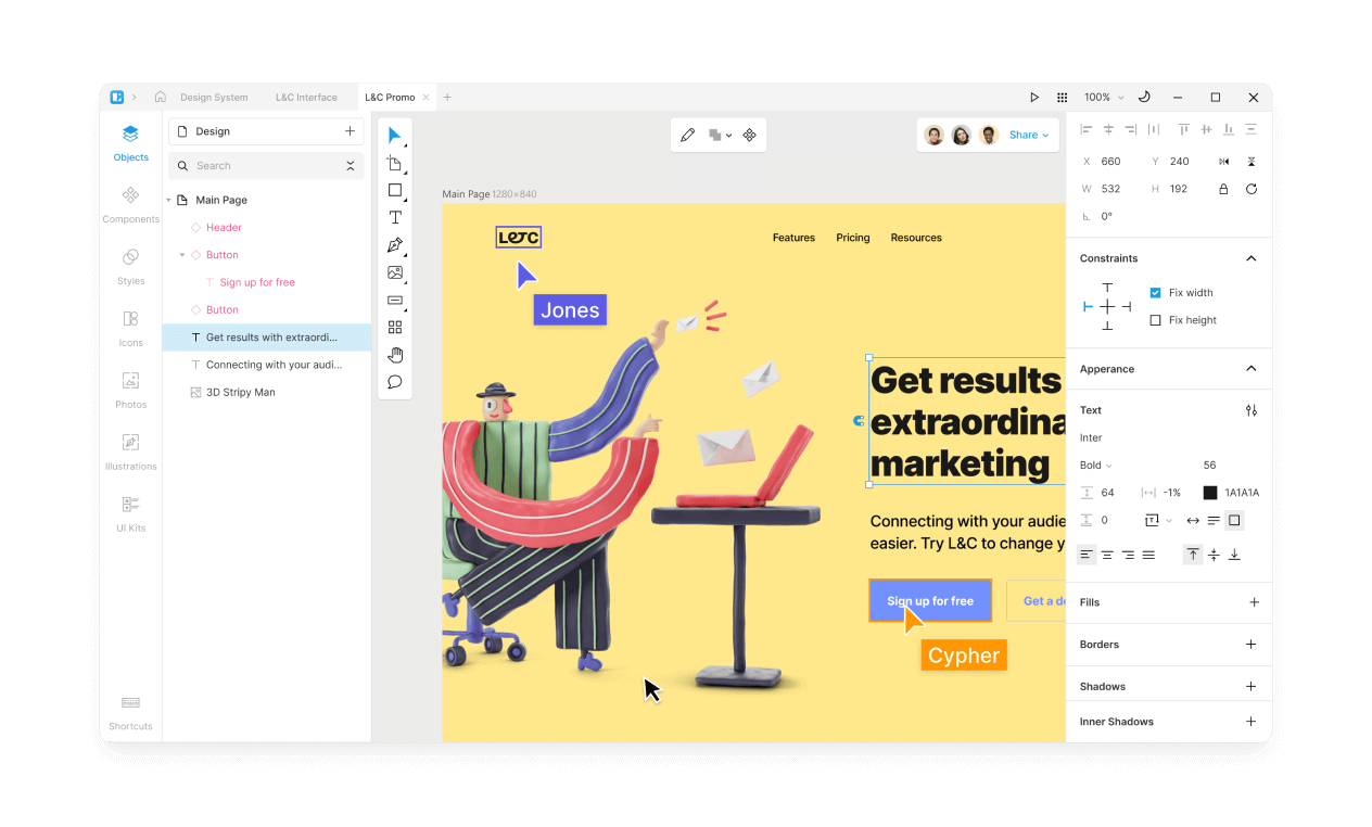 ภายในโปรแกรมนี้มีระบบที่สามารถทำงานร่วมกับเพื่อนๆ พร้อมกันได้ แชร์ตัวงานออกแบบ และจัดเรียงแก้ไข ไปพร้อมๆ กันได้สูงสุด 100 คน ทำงานได้แบบสดๆ เรียลไทม์ (Real-Time) สามารถทำงานแบบ Offline และ Online ได้
