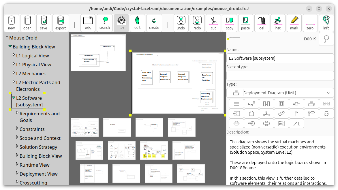 Crystal-Facet-UML is an Open-Source program designed for creating UML and SysML diagrams used in designing and documenting system and software architecture. Its core concept revolves around representing multiple "Facets" or viewpoints of the same system akin to a crystal reflecting different aspects of the same object. This tool enables software developers to construct a comprehensive set of diagrams, encompassing use cases, requirements, structure, behavior, and system deployment, while maintaining consistency in element naming and hierarchical relationships across diagrams.