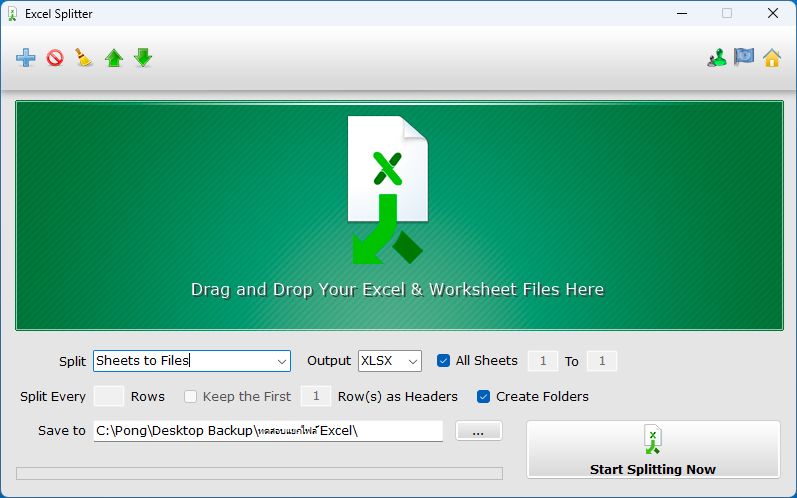 การบันทึกไฟล์ Excel แยกตามชีต (แยกออกเป็น 1 ชีต ต่อ 1 ไฟล์) ก็ทำได้ง่าย ๆ แค่เพียงเรียกเปิด โปรแกรมแยกไฟล์ Excel Splitter ขึ้นมา จากนั้นเลือกออปชันการ Split ให้เป็นแบบ 'Sheet to Files' โดยสามารถกำหนดได้ว่าจะให้ทำการแยกบันทึกไฟล์สำหรับทุกชีต (All Sheets) หรือกำหนดให้แยกบันทึกไฟล์เฉพาะช่วงชีตใด ๆ ได้ตามต้องการ