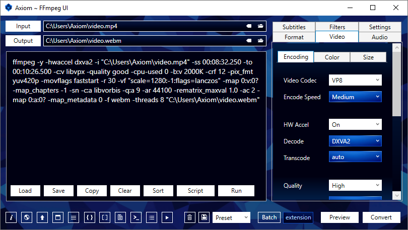 Axiom is a graphical user interface (GUI) tool for the Windows operating system, designed to serve as a user-friendly interface for FFmpeg and FFprobe powerful command-line utilities used for encoding and converting multimedia files. Traditionally operated via command-line interface (CLI), these tools can be complex for general users. Axiom acts as a bridge, allowing users to access FFmpeg’s capabilities through a graphical window, eliminating the need to manually enter commands.
