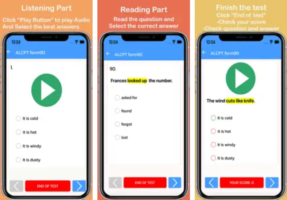 ALCPT (แอปพลิเคชันฝึกภาษาอังกฤษมาตรฐานอเมริกัน พร้อมทดสอบความรู้) : แอปพลิเคชันนี้ มีนามว่า แอปพลิเคชัน ALCPT ย่อมาจาก "American Language Course Placement Test" เหมาะสำหรับคนที่ต้องการทดสอบความสามารถการใช้ภาษาอังกฤษ ทั้งด้านไวยากรณ์ และ คำศัพท์ ด้วยการการฟังและการอ่าน ซึ่งแอปพลิเคชัน ALCPT ประกอบด้วยการทดสอบทั้งหมด 50 บท และแต่ละบทจะมีข้อสอบปรนัยแบบ 4 ตัวเลือกจำนวน 100 ข้อ ซึ่งแบ่งออกเป็น 2 ส่วนคือ การฟังและการอ่าน โดยทุก ๆ บทจะมีระดับความยากที่ใกล้เคียงกันทั้งหมด จึงเหมาะกับการฝึกฝนการใช้ภาษาอังกฤษให้เกิดความชำนาญ