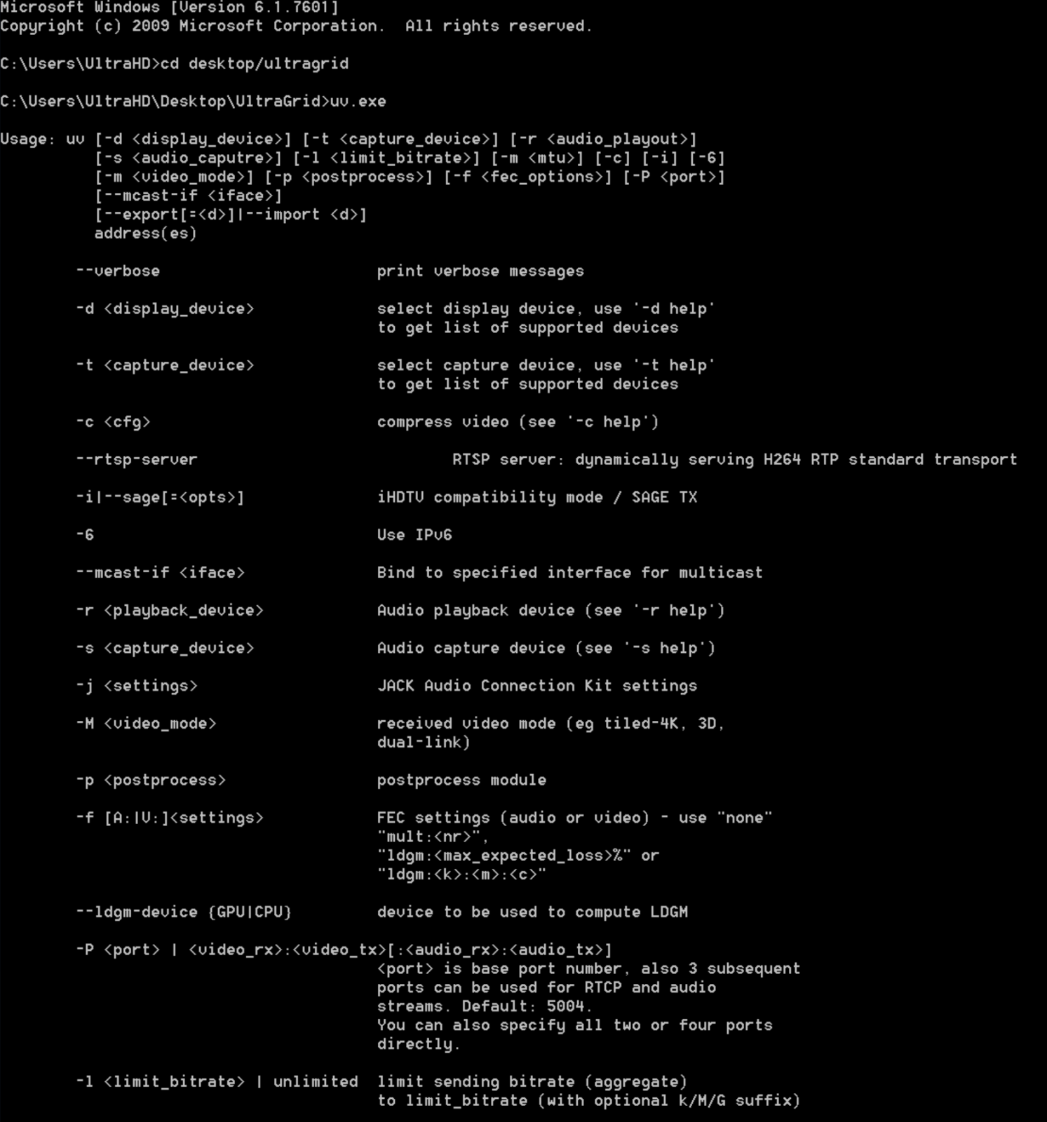อย่างไรก็ตาม โปรแกรม UltraGrid ยังไม่เป็นมิตรต่อผู้ใช้งานมือใหม่ เนื่องจากรูปแบบการติดตั้ งและการใช้งานของ UltraGrid ในปัจจุบันยังคงเป็นแบบ ส่วนติดต่อผู้ใช้แบบบรรทัดคำสั่ง (CLI) ยังไม่มี ส่วนติดต่อผู้ใช้งานแบบกราฟิก (GUI) ให้ใช้งาน อย่างไรก็ตาม ขณะนี้ทีมพัฒนากำลังดำเนินการสร้าง GUI ขึ้นมาอยู่ ซึ่งจะช่วยให้โปรแกรมใช้งานได้สะดวก และเป็นมิตรมากยิ่งขึ้นในเร็ว ๆ นี้