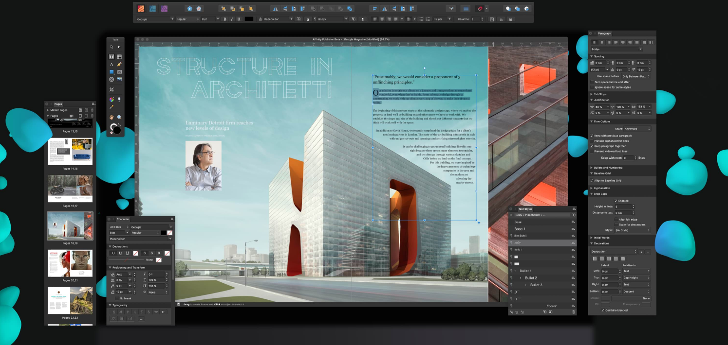 โปรแกรมออกแบบสิ่งพิมพ์ นิตยสาร Affinity Publisher มีคุณสมบัติเด่น ในเรื่องของการรองรับฟอนต์ตัวอักษรที่หลากหลาย สามารถช่วยให้คุณออกแบบเนื้อหาข้อความให้เด่น โดนตา กระแทกใจผู้อ่าน ในด้านกราฟิกเองก็มีเครื่องมือต่าง ๆ มากมาย ให้เลือกใช้ และยังรองรับการทำงานร่วมกับไฟล์ .IDML ที่ใช้กับ โปรแกรมออกแบบสิ่งพิมพ์ Adobe InDesign ได้อีกด้วยเช่นกัน