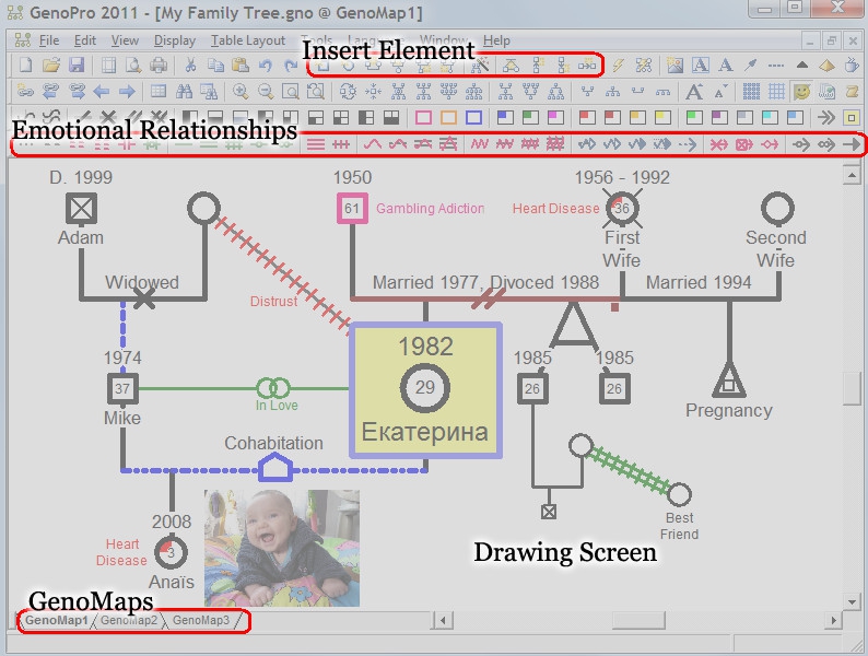 This program is called "GenoPro". It is a specialized tool for drawing family trees and genograms. GenoPro's intuitive graphical user interface quickly produces professional-looking pedigree family trees ready for printing or for pasting to any presentation software. GenoPro is more than genealogy; it can visually document an entire community, including emotional relationships and social connections among people.
