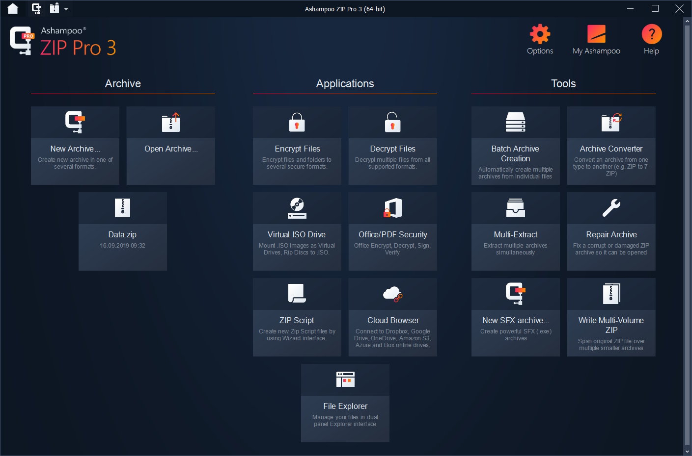 This program is called "Ashampoo ZIP Pro 3". It is not only a simple ZIP program, it's an entire suite that features everything you need to compress, extract, send and encrypt your files. ZIP Pro 3 safely handles 60 formats with ease. Multi-core support speeds up archive creation and optional 256-bit encryption provides that extra bit of security. The integrated automatic backup feature supports both local and external storage solutions such as cloud or FTP services.