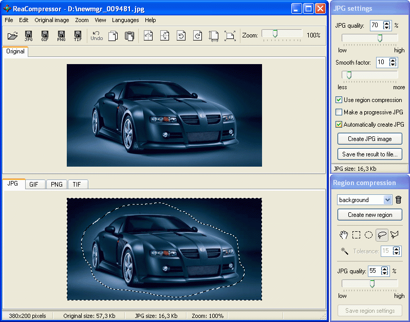 This program is called "ReaCompressor" is a take the most effective compression format (JPG, GIF, PNG or TIF) for the web, e-mail, fax, storing, etc., edit and optimize images with your own settings to see changes in real time. It supports 340 input formats, multipage GIF/TIFF files, TWAIN devices (e.g. scanner, digital camera), region specific compression that allows to produce JPG files some areas of which are compressed more or less than others and features multi-lingual interface.