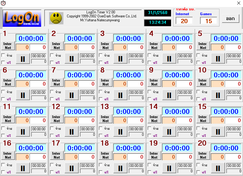 Note : โปรแกรมร้านอินเทอร์เน็ต LogOn Timer นี้ ทางผู้พัฒนา โปรแกรม (Program Developer) เขาได้แจกให้ ทุกท่านได้นำไปใช้กันฟรีๆ (FREE) โดยคุณ ไม่ต้องเสียค่าใช้จ่ายใดๆ ทั้งสิ้น นอกจากนี้แล้ว คุณยังสามารถที่จะ ติดต่อกับทาง ผู้พัฒนาโปรแกรมนี้ได้ผ่านทางช่องทางอีเมล (E-Mail) : oser2401@hotmail.com (ภาษาอังกฤษ) ได้ทันทีเลย