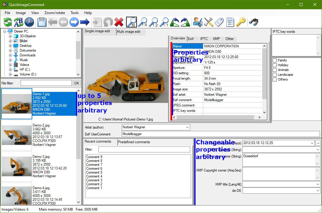 Features: The program displays all EXIF, IPTC and XMP properties, as well as some other file properties such as modification date. In addition to the full lists of EXIF, IPTC and XMP properties a list of properties is displayed, which is configurable. In addition to user comment and artist further EXIF, IPTC and XMP properties can be changed.