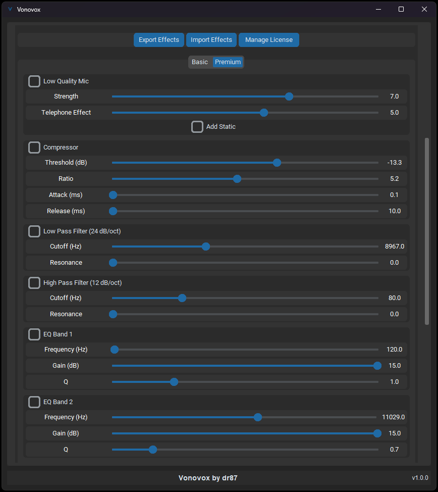 โปรแกรม Vonovox ยังมีระบบ Post‑Processing ในตัว เช่น การลดเสียงรบกวน (RNNoise, Silero VAD), Noise Gate, Equalizer, Compressor, Reverb, Chorus, Low/High‑Pass Filter และยังมีอัลกอริทึม AP‑BWE สำหรับการอัปสเกลความถี่เสียงให้กว้างขึ้น ซึ่งทำงานแบบเรียลไทม์ จากเดิมที่ต้องทำงานด้วยการเตรียมไฟล์เสียงไว้ล่วงหน้า เพื่อให้เสียงที่ได้มีความใส และชัดเจนมากขึ้น