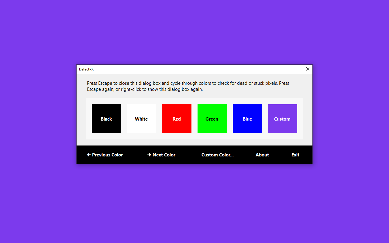 สำหรับการใช้งาน โปรแกรมเช็คจุดเสียบนหน้าจอ DefectPX เมื่อเปิดโปรแกรมขึ้นมา ตัวโปรแกรมจะแสดงหน้าจอสีเต็มจอคอมพิวเตอร์ เราสามารถเลือกเช็คสีเองได้ เลือกปรับสีต่างๆ ไล่ตั้งแต่สีดำ ขาว แดง เขียว น้ำเงิน เมื่อเลือกสีเสร็จ ให้กด "ปุ่ม ESC" (Escape) เพื่อทำให้แสดงสีเต็มหน้าจอ หากจอมีจุดที่เสียหายเราจะเห็นว่าจอขึ้นเป็นจุดสีดำ นั่นหมายความว่าจุดพิกเซลนั้น ไม่สามารถแสดงผลสีที่เราเลือกได้ หากคุณต้องการเช็คสีอื่นๆ เพิ่มเติมก็สามารถเลือก "ปุ่ม Custom Color.." เองได้ หากต้องการกดกลับ ให้กด "ปุ่ม ESC" อีกครั้งและปิดหน้าโปรแกรมได้ทันที