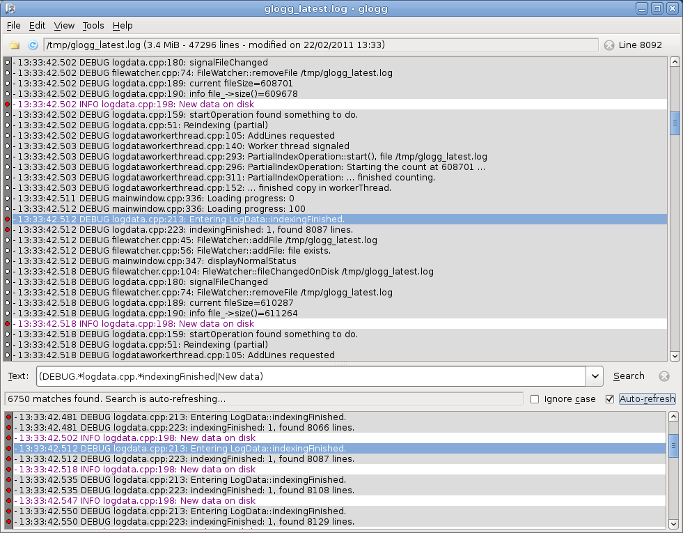 This program is called "glogg" is a multi-platform GUI application to browse and search through long or complex log files. It is designed with programmers and system administrators in mind. glogg can be seen as a graphical, interactive combination of grep and less.