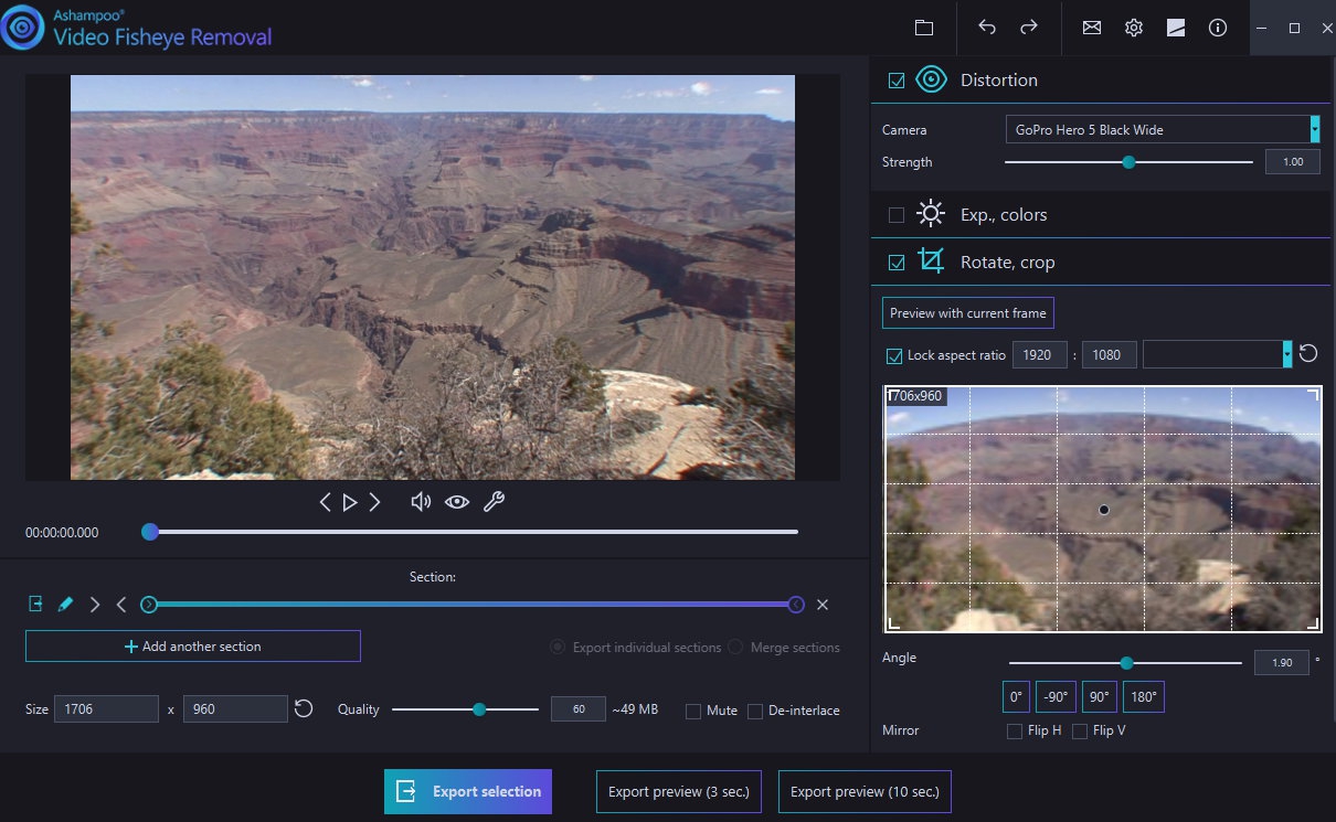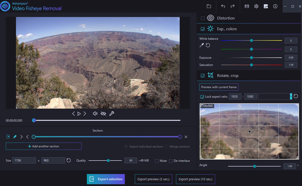 The built-in live preview allows for precise manual adjustments to white balance, exposure and colors. Ashampoo Video Fisheye Removal is the indispensable help for GoPro and other action cam owners for 100% realism!