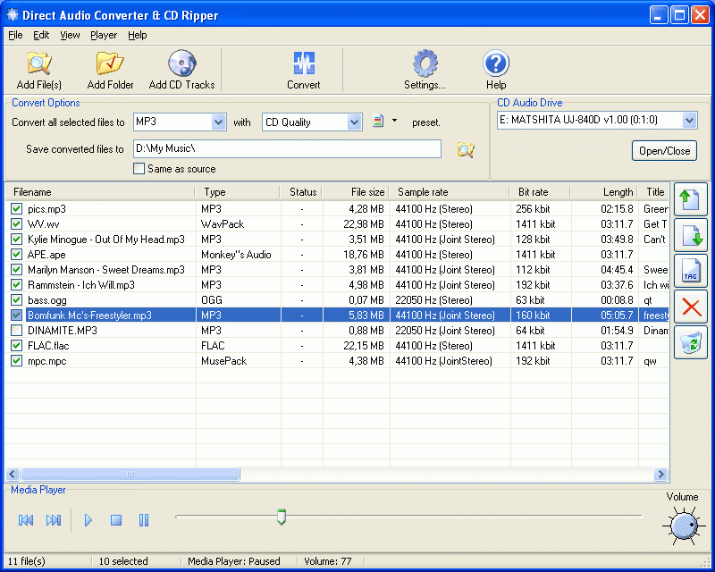 Direct Audio Converter and CD Ripper (โปรแกรมแปลงไฟล์ออดิโอจากแผ่น CD) : สำหรับโปรแกรมนี้มีชื่อว่า โปรแกรม Direct Audio Converter and CD Ripper จัดเป็นอีกหนึ่ง โปรแกรมแปลงไฟล์ ชั้นนำ ที่ถูกพัฒนาโดย บริษัท Piston Software ผู้พัฒนาโปรแกรมแปลงไฟล์มากมาย โดยโปรแกรมนี้มันมาพร้อมกับความสามารถ ในการแปลงไฟล์มัลติมีเดียต่างๆ จากแผ่น CD ได้อย่างมีประสิทธิภาพ เนื่องจากมันสามารถแปลงไฟล์ออดิโอ (Audio) บนแผ่น CD ให้ออกมาในรูปแบบของสกุลไฟล์เพลง อาทิไฟล์ MP3 WMA WAV OGG Monkey"s Audio APE หรือ MusePack MPC ได้โดยไม่เสียคุณภาพเดิม