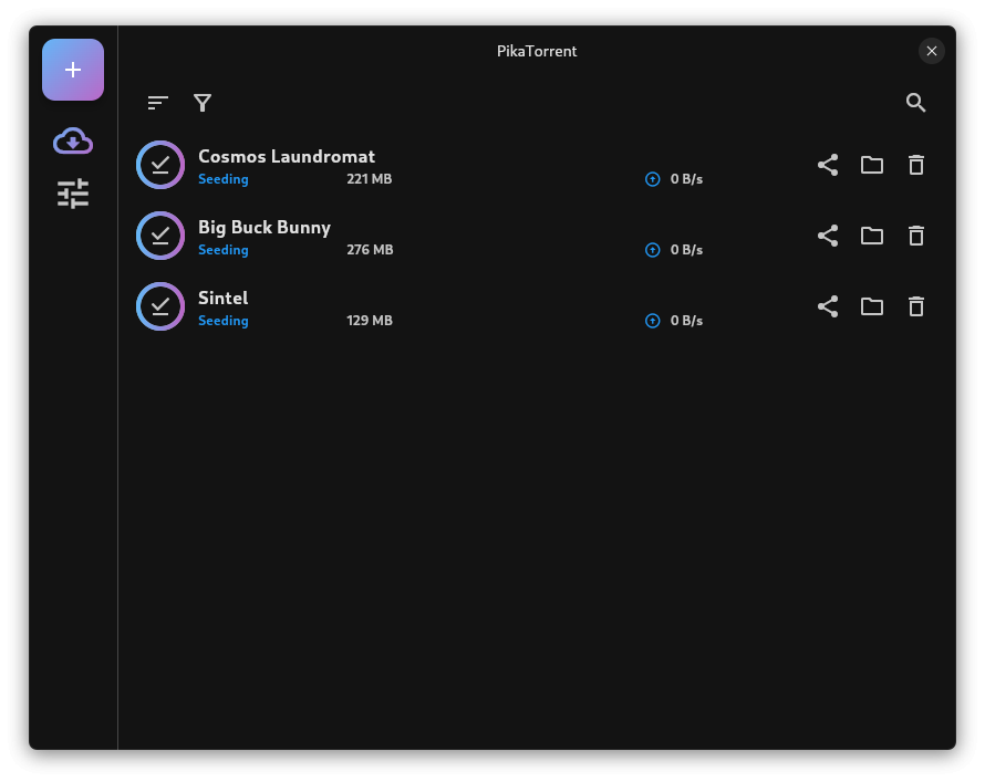 PikaTorrent (โปรแกรม BitTorrent มินิมอล เน้นใช้งานง่าย) : สำหรับโปรแกรม PikaTorrent เป็นโปรแกรม BitTorrent แบบ โอเพ่นซอร์ส (Open-Source) ที่ถูกออกแบบมาโดยให้ความสำคัญกับความเรียบง่าย และทันสมัย บนทุกแพลตฟอร์ม ไม่ว่าจะเป็น ระบบปฏิบัติการ (OS) อย่าง วินโดวส์ (Windows), แมคโอเอส (macOS), ลีนุกซ์ (Linux), Android และ iOS โดยมีเป้าหมายเพื่อให้ผู้ใช้ระดับทั่วไป สามารถสตรีม และดาวน์โหลดไฟล์ ทอร์เรนต์ (Torrent) ได้ โดยไม่ต้องมีความรู้เชิงเทคนิคลึกเหมือนโปรแกรมทอร์เรนต์อื่น ๆ ตัวโปรแกรมถูกพัฒนาด้วย Flutter ซึ่งช่วยให้สามารถสร้าง ส่วนต่อประสานกับผู้ใช้ (UI) ที่สอดคล้องกันในทุกระบบปฏิบัติการ ทั้ง คอมพิวเตอร์ (PC) และสมาร์ทโฟน