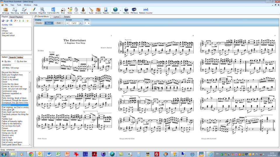 This program is called "Power Music Essentials". It is a free version of Power Music. Ideal for anyone who want to liberate themselves from the hassle of paper music. An incredibly powerful piece of free software. Power Music Essentials does everything you need to move to digital music storage and display. Use your PC, laptop or tablet as your own digital music stand. No more paper!