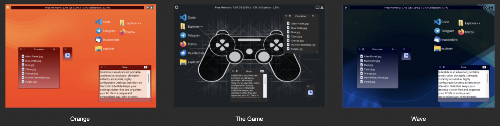 SideSlide (โปรแกรมจัดการ Workspace เสริมการทำงานของหน้า Desktop) : โปรแกรม SideSlide เป็นโปรแกรมเสริมบนหน้าเดสก์ท็อป (Desktop Screen) ที่พัฒนามาเพื่อช่วยให้ผู้ใช้งาน สามารถจัดระเบียบพื้นที่ทำงานบนหน้าจอของ เครื่องคอมพิวเตอร์ PC ได้อย่างมีประสิทธิภาพ โดยที่ไม่รบกวนการทำงานตัว ระบบปฏิบัติการ (OS) โปรแกรมนี้ทำหน้าที่ได้มากกว่าการเป็นเพียงแค่ทางลัดสำหรับเรียกใช้งานโปรแกรม แต่มันจะทำงานได้เสมือนเป็น ส่วนขยาย (Extension) ของหน้าเดสก์ท็อปที่มีเครื่องมือให้เลือกใช้งานได้อีกมากมาย เช่น สร้างคอนเทนเนอร์ที่สามารถย่อ, พับ แยกออกจากหน้าจอหลัก หรือแม้แต่ขยายออกไปนอกขอบจอได้ เพื่อให้ผู้ใช้สามารถจัดวางทางลัด, คำสั่ง, ลิงก์ URL, ฟีด RSS, รูปภาพต่าง ๆ, บันทึกเตือนความจำ และโน้ตต่าง ๆ ได้ตามต้องการ