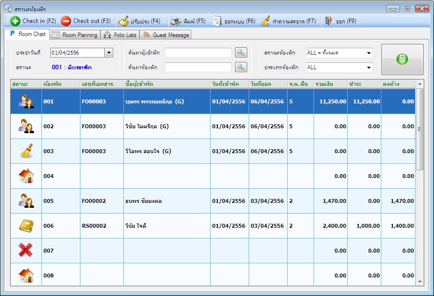- สามารถตรวจสอบสถานะของห้องพักแบบต่างๆคือ ห้องพักว่าง ห้องพักมีการจอง ห้องพักมีแขกพักอยู่ ห้องพักที่ต้องเช็คเอ้าท์ (Check Out) และ ห้องพักงดใช้งาน
