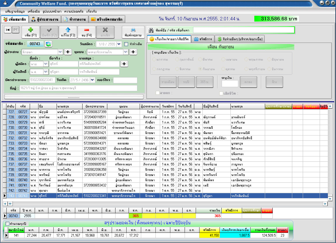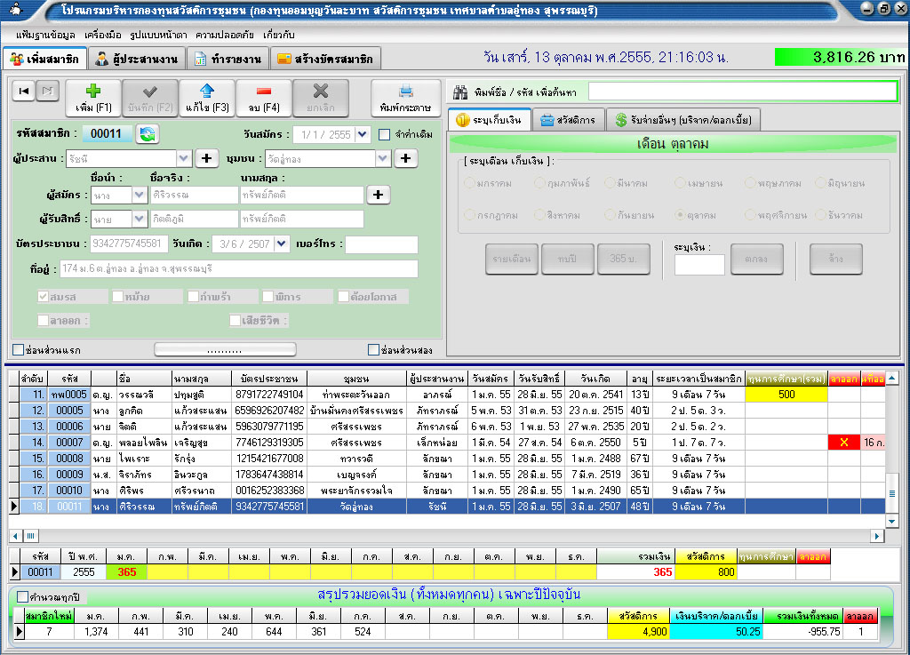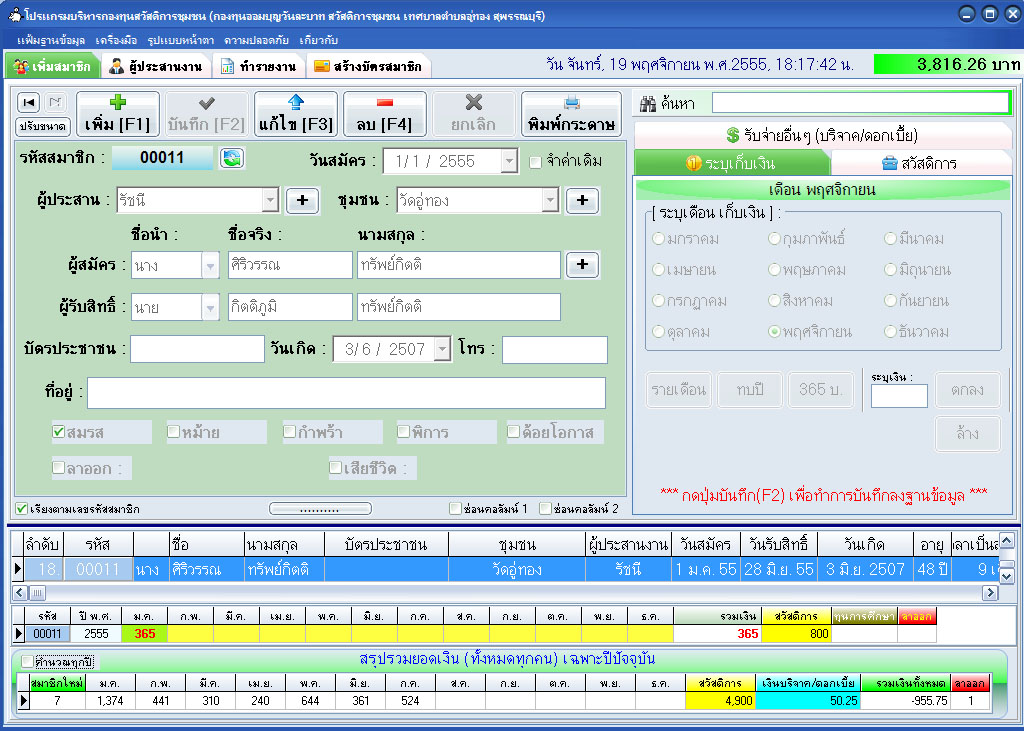 ได้แก้ไขปรับปรุงเพิ่มเติมดังนี้ 1. เพิ่มปุ่มปรับเพิ่ม/ลดขนาดตัวอักษรที่หน้า "เพิ่มสมาชิก" และ "ผู้ประสานงาน" เพื่อเป็นประโยชน์ในการช่วยป้อนข้อมูลซึ่งจะแสดงตัวอักษรที่ใหญ่สบายตามากยิ่งขึ้น 2. เพิ่มหัวข้อติ๊กถูก "เรียงตามเลขรหัสสมาชิก" ที่หน้า "เพิ่มสมาชิก" และ "ผู้ประสานงาน" เพื่อเรียงข้อมูลสมาชิก/พิมพ์ลงกระดาษ (จะมีประโยชน์กรณีที่ไม่มีการตั้งค่ารหัสชุมชนซึ่งจะแสดงการเรียงตามตัวเลขสมาชิกอย่างเดียว) 3. ปรับขนาดตัวอักษรในจุดอื่นๆ ให้ใหญ่ขึ้น 4. ที่หน้า "ผู้ประสานงาน" ได้เพิ่มปุ่มระบุเงินต่างๆแบบทุกคน และเมื่อมีการคลิกที่หน้า "ทุกคน"จะแจ้งเตือนก่อนเพื่อป้องกันความผิดพลาด ขอบคุณค่ะ รัชนี สิวายะวิโรจน์ (ทีมงานกองทุนสวัสดิการชุมชน) |