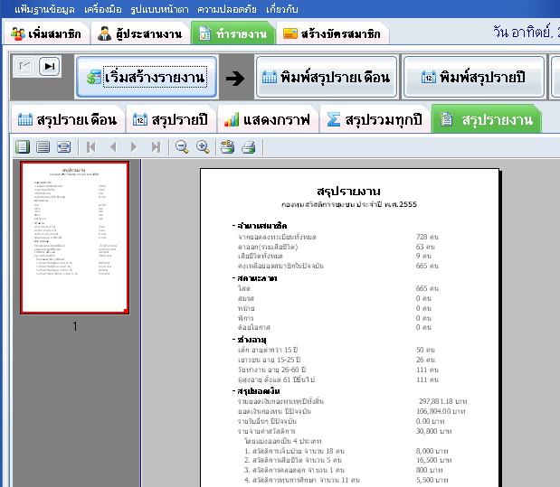 ได้แก้ไขปรับปรุงเพิ่มเติมดังนี้ 1. เพิ่มการอัพเดทวันที่และอายุของสมาชิกให้ในทุกๆครั้งที่เข้าใช้งานโดยสามารถเลือกหรือยกเลิกได้ 2. เพิ่มการสร้างรายงานแบบละเอียดในรูปแบบข้อความตัวอักษร ซึ่งจะสร้างรายงานได้ก็ต่อเมื่อมีการกดปุ่ม "เริ่มประมวลผลข้อมูล" ที่หน้าแท็บทำรายงาน พร้อมกันนั้นก็จะมีการปรับปรุงอัพเดทจากข้อ 1. พร้อมกันไปด้วย 3. เพิ่มสถานะภาพของแต่ละสมาชิก โดยจะมีช่องให้ติ๊กถูกเพิ่มขึ้นมาอีก 5 หัวข้อ คือ สมรส,หม้าย,กำพร้า, พิการ และ ผู้ด้อยโอกาส เพื่อใช้ในการสรุปสร้างรายงานจากข้อ 2. 4. แก้จุดบกพร่องในการระบุเงินที่ต่ำกว่า 32 บาทลงมาซึ่งจะกดปุ่มล้าง(ลบทิ้งออก)ไม่ได้ 5. เพิ่มหน้าการตั้งค่าโปรแกรมเพื่อกำหนดการใช้งานต่างๆเพิ่มมากขึ้น เช่น การปรับตัวเลขระบุเงินของปุ่มรายเดือน, ทบปี และ รายปี ให้มีค่าตัวเลขตามแต่ละชุมชนที่ได้กำหนดไว้ตามระเบียบการ โดยเลือกได้ว่าต้องการให้ในแต่ละเดือนใช้ค่าวันที่สูงสุดของแต่ละเดือน หรือ กำหนดเป็นค่า 30 ในทุกๆเดือน เป็นต้น 6. เพิ่มคอลัมน์แสดงระยะเวลาการเป็นสมาชิก โดยจะแสดงเป็นรูปแบบ "xxx ปี xx เดือน xx วัน" 7. แก้ไขการรีเฟรชตารางที่หน้าผู้ประสานงานโดยจะไม่มีการรีเฟรชตารางใหม่ถ้าหากไม่มีการเปลี่ยนแปลงข้อมูล 8. ปรับหน้าต่างแสดงรายละเอียดของสมาชิกให้กว้างขึ้น 9. ปรับตำแหน่ง ลาออก และ เสียชีวิตให้อยู่ในกรอบป้อนข้อมูลสมาชิกเพื่อให้ง่ายต่อการปรับแก้ 10. แก้ไข ระบบรวมไฟล์ฐานข้อมูล ในส่วนของหน้าต่างการโหลดไฟล์โดยให้สามารถเลือกโฟลเดอร์อื่นๆได้ 11. ปรับหน้าต่างระบบรักษาความปลอดภัยใหม่ และกรณียกเลิกไม่ใช้งานรหัสผ่านโปรกรมสามารถกดยกเลิกได้เลยไม่ต้องใส่รหัสผ่านเดิมแล้วเพื่อลดขั้นตอนยุ่งยาก 12. แก้ขนาดตัวเลขของคอลัมน์ทุนการศึกษาให้ถูกต้องเมื่อมีการปรับเปลี่ยนขนาดตัวอักษรของตารางสมาชิก ขอบคุณค่ะ รัชนี สิวายะวิโรจน์ (ทีมงานกองทุนสวัสดิการชุมชน) |