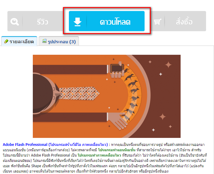 Note : สำหรับในส่วนของ โปรแกรมสร้างภาพเคลื่อนไหว Adobe Flash Professional นี้ มีคุณสมบัติเป็นแชร์แวร์ (Shareware) ซึ่งทางผู้พัฒนา โปรแกรม (Program Developer) เขาให้ท่านได้สามารถ นำไปใช้กันก่อนเป็นจำนวน 30 วัน หากต้องการจะใช้ต่อกันในแบบตัวเต็มๆ สามารถสั่ง ซื้อโปรแกรม Adobe Flash Professionnal ได้แล้วที่ Shop Thaiware