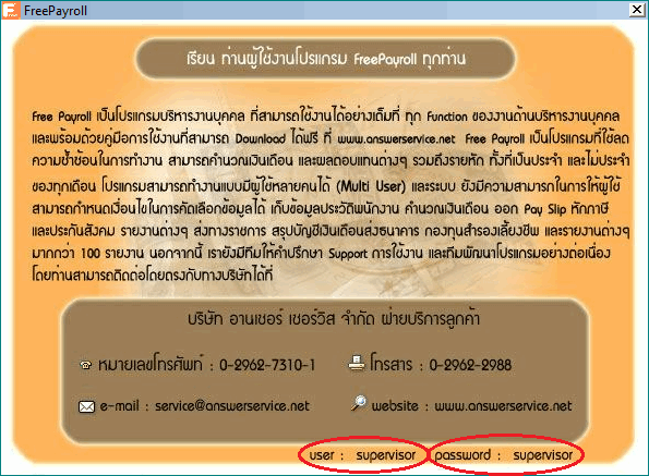 Note : สำหรับ โปรแกรม FreePayroll นี้มีคุณสมบัติเป็น ฟรีแวร์ (Freeware) ท่านสามารถนำไปใช้ได้โดยไม่ต้องเสียค่าใช้จ่ายใดๆ ทั้งสิ้น โดยท่านสามารถติดต่อผู้จัดทำโปรแกรมนี้ได้ทางช่องทางอีเมล (E-Mail) : marketing@csc.co.th (ภาษาไทย หรือ ภาษาอังกฤษ) หรือทางเบอร์โทรศัพท์ 0-2580-8060 (ภาษาอังกฤษ หรือ ภาษาไทย) นี้ได้เลย