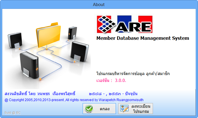 Note : โดยสำหรับ โปรแกรมเก็บข้อมูลลูกค้า และ โปรแกรมระบบสมาชิก Member Management Systems ตัวนี้มีคุณสมบัติเป็น Shareware ทางผู้พัฒนา โปรแกรม (Program Developer) เขาให้ท่านได้นำไปใช้กันก่อน (บันทึกกิจกรรม) บันทึกสมาชิก 10 คน งานบริการ ได้ 50 รายการ 30 วัน เท่านั้น ข้อมูลสมาชิกได้ไม่จำกัด หากถ้าท่านต้องการจะใช้ต่อกันในแบบตัวเต็มๆ (Full Version) หรือ แบบไม่มีการจำกัดจำนวนรายการ ท่านจะต้อง เสียค่าลงทะเบียน (Register) เป็นเงินจำนวน 5,000.00 บาท